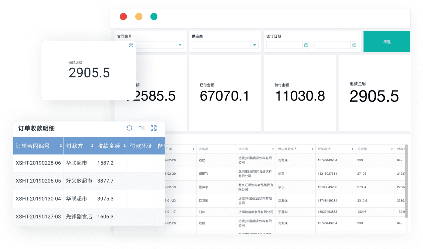 - 所有数据支持按条件筛选,方便销售、采购对账。