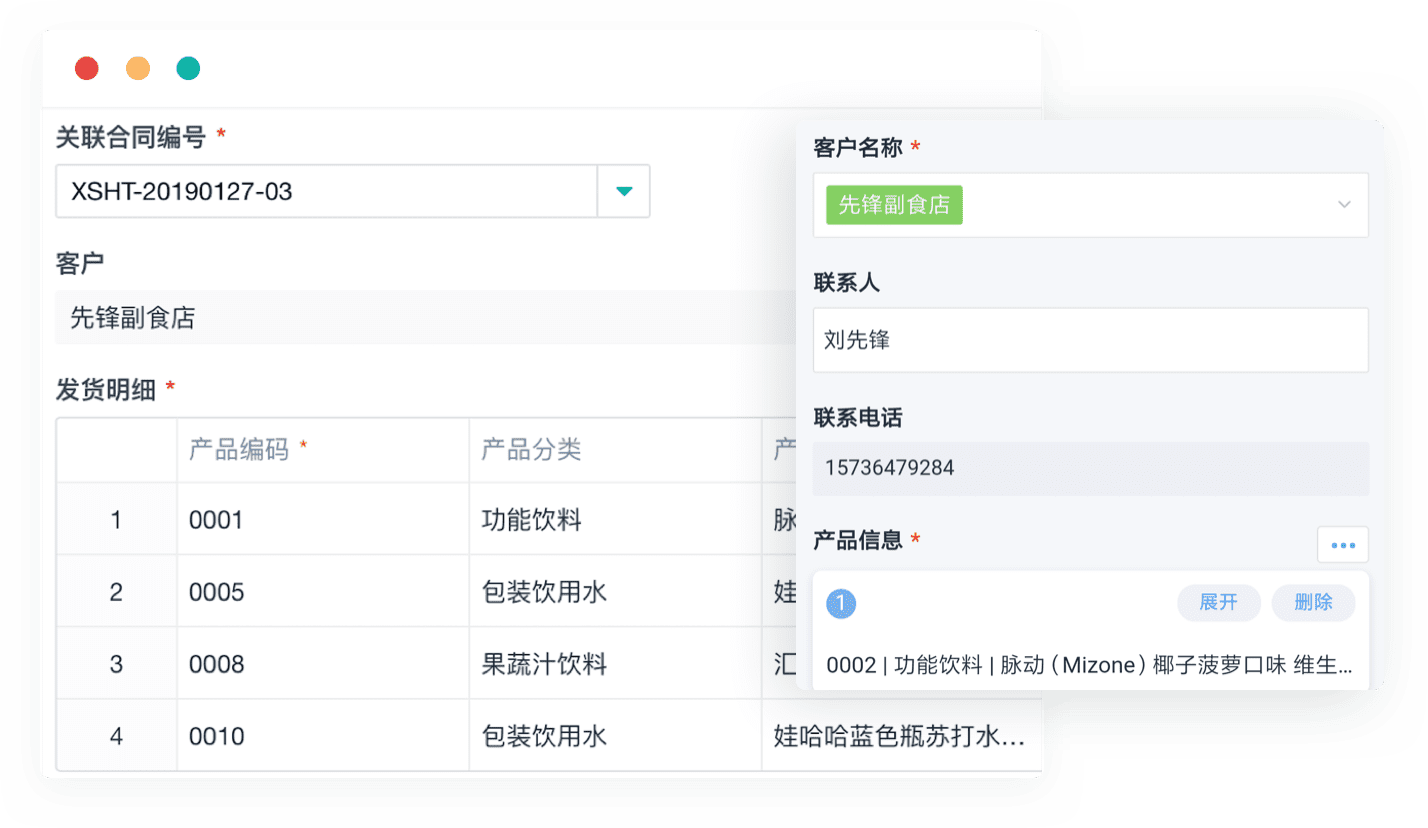 - 业务员根据合同编号调取客户信息,智能发货退货。