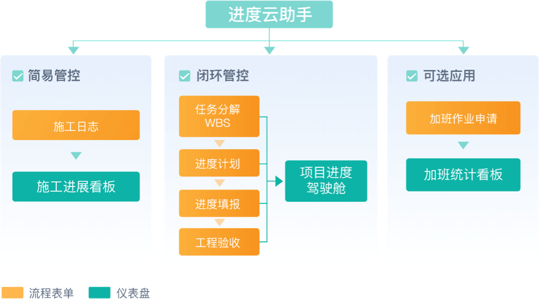 手机端轻松录入施工日志,可自由编辑打印模板,一键打印所见即所得,方便材料归档。建立进度“WBS分解+计划+产值填报+验收”闭环管控体系,额外可灵活增加如加班作业申请、特殊工艺施工等可选应用。