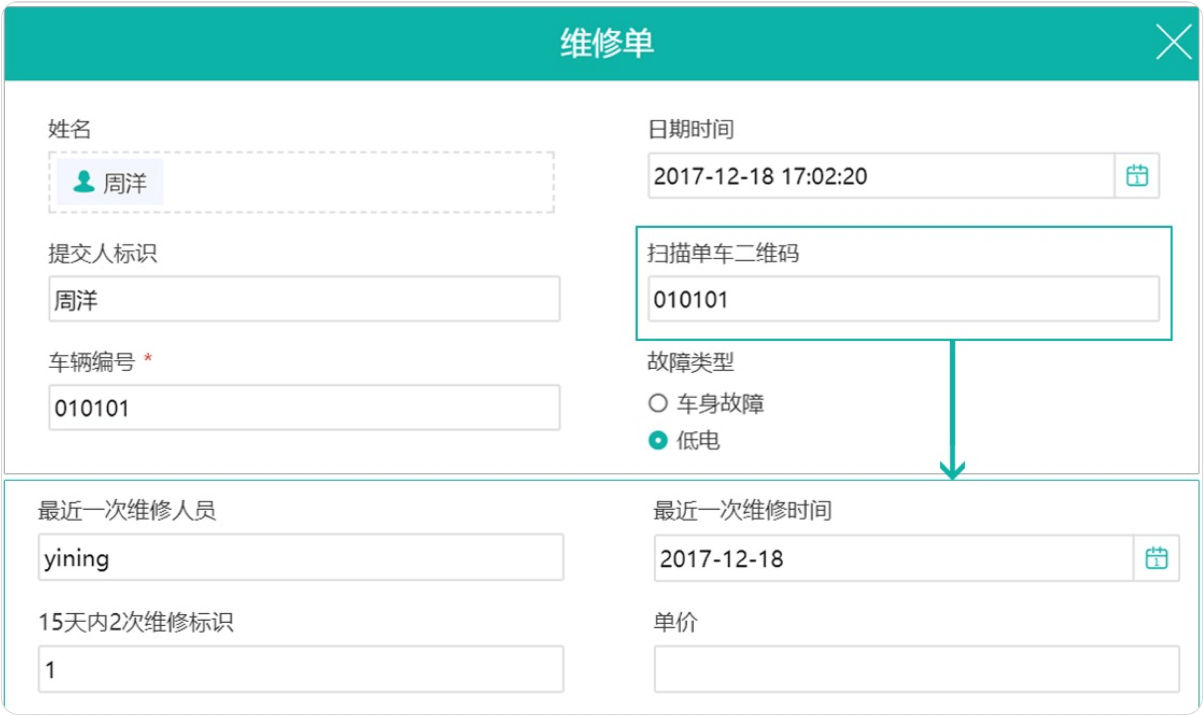 效果:收集对准单车身上的二维码进行扫码,可自动获取单车编号, 录入单车二维码后,系统可自动显示该车最近一次被维修时间和维修负责人, 一线工作人员几分钟快速上手